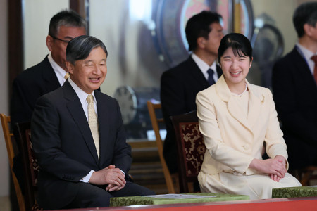 秋季雅楽演奏会に臨まれる天皇陛下と長女愛子さま=26日午前、宮内庁楽部(代表撮影) 【時事通信社】