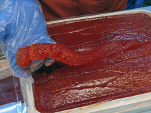 弘前の市場「虹のマート」にある「ハマダ海産」が2月13日・14日、ハート型の容器に入ったすじこ「愛の一口すずこ」を販売する。