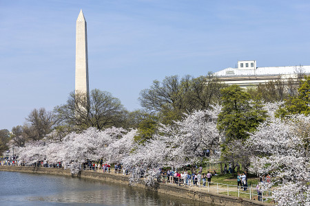 26日、米ワシントンのポトマック川の入り江「タイダルベイスン」で満開となった桜。当初の予想より数日早く満開を迎えたといい、辺りは観賞する人々でにぎわった。 【EPA時事】