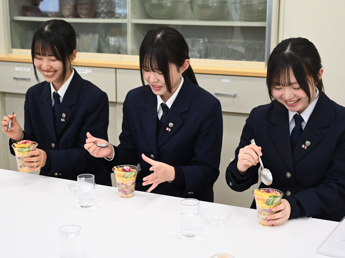 試食する高校生3人