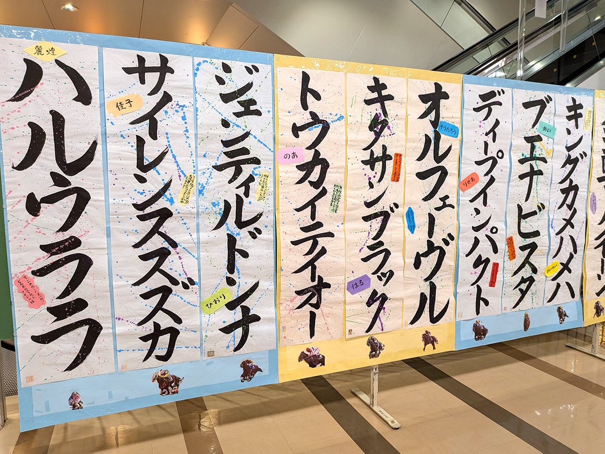 「ハルウララ」「ディープインパクト」などの名馬が並ぶ書道展