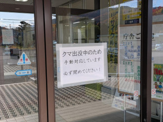 西目屋村が11月4日、クマ対策として同役場庁舎の玄関入り口の自動ドアを手動に切り替えた。