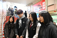 弘前公園のカルガモが現在、氷上で吹雪に耐えている。