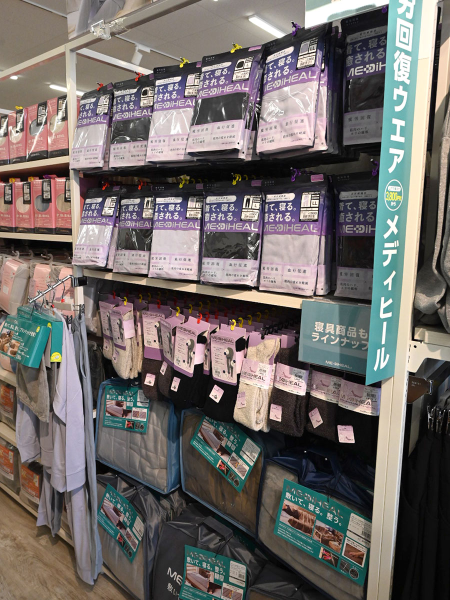 長軸シャツやロングパンツのほか、敷パッドやブランケットなどを用意する。メディヒールは「一般医療機器」である「家庭用遠赤外線血行促進用衣」を用いている