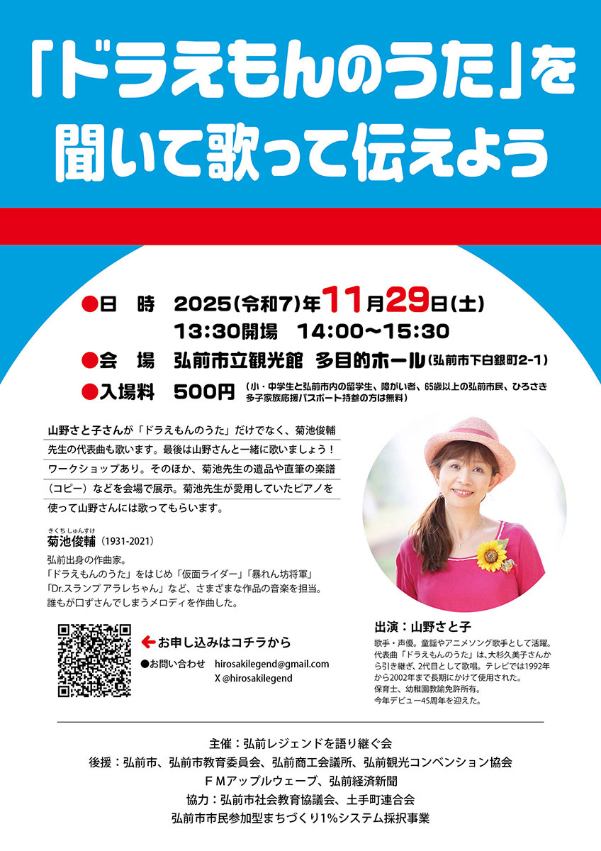 ライブ&トークイベント「ドラえもんのうたを聞いて歌って伝えよう」が11月29日、弘前市立観光館(弘前市下白銀町)多目的ホールで開催される。