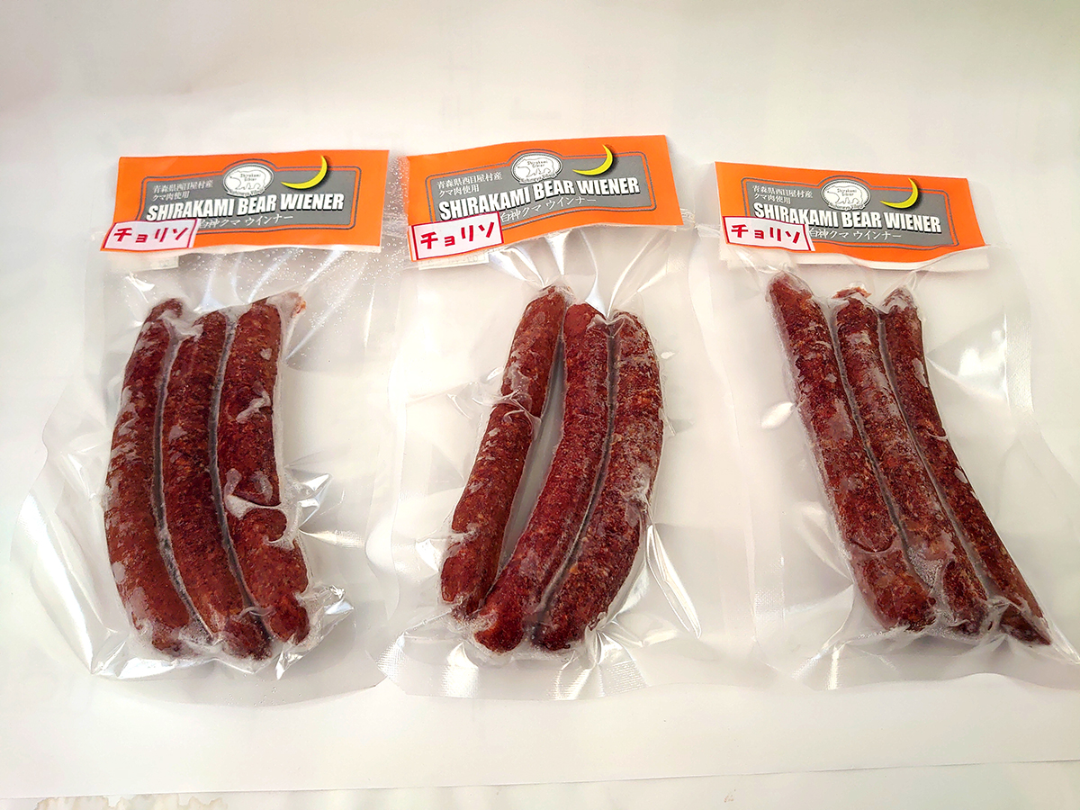 クマ肉を加工したウインナーチョリソ味(3本=1,000円)。道の駅「津軽白神」で販売