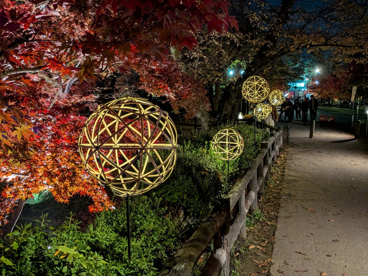 写真に収める見物客が多くいた。ライトの明かりで輝いているように見える