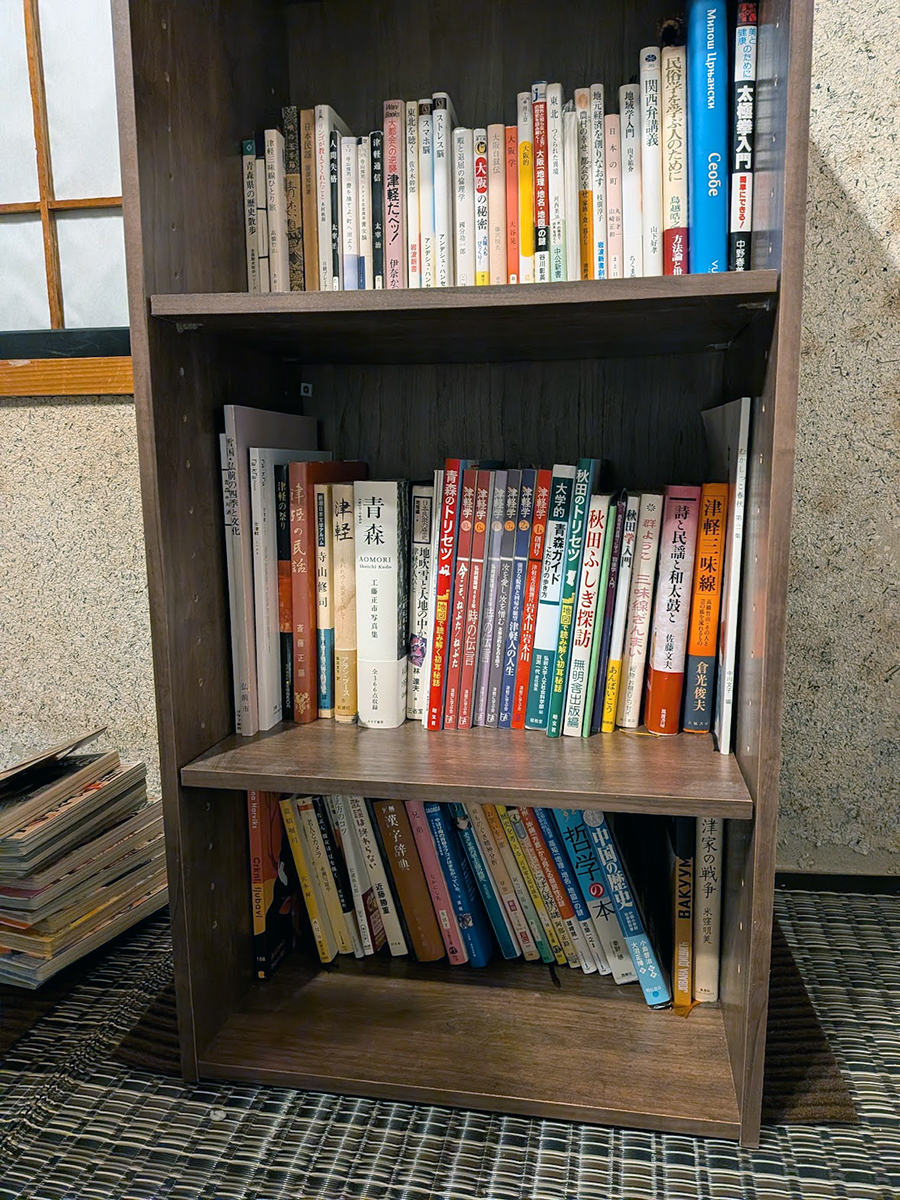 青森に関する本や民俗学などの書籍が並ぶ。フィリップさんはドイツ語、英語など4カ国語を話せる。津軽弁はわからないという