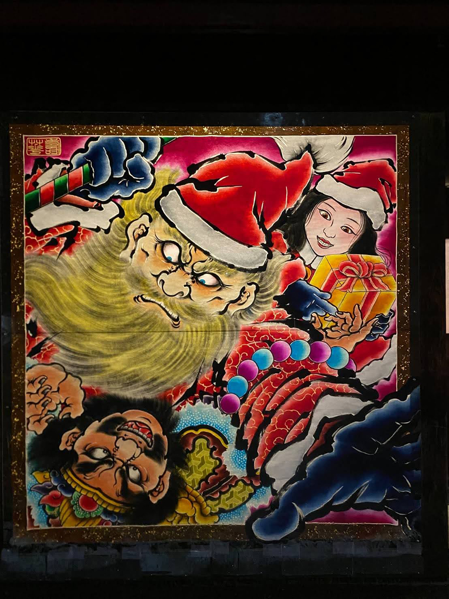 青森・黒石の観光交流施設「松の湯交流館」(黒石市中町、TEL 0172-55-6782)に飾られた、クリスマスをテーマにしたねぷた絵が現在、訪れる人々の目を楽しませている。
