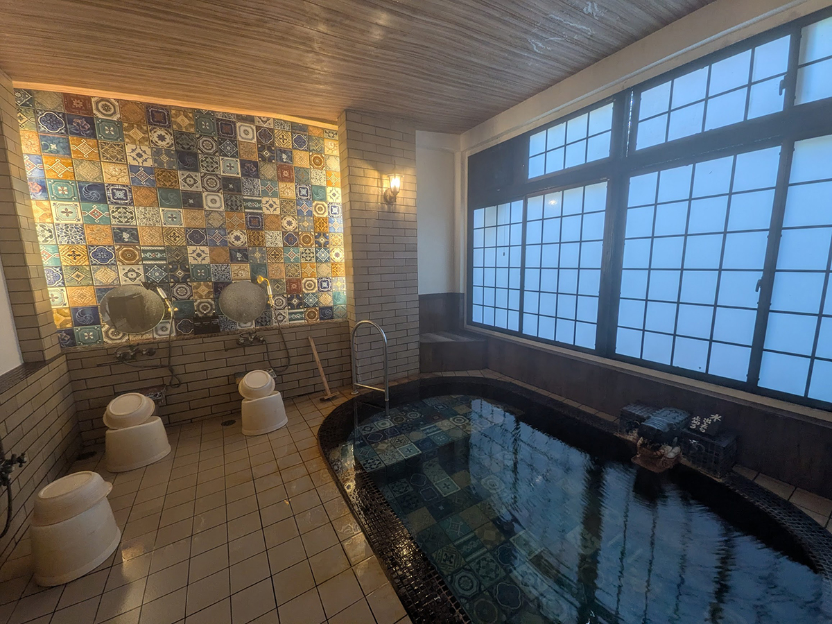 マジョリカタイルの浴室。宿泊者のみ利用可能。SNSでは度々話題となる。写真は男性用