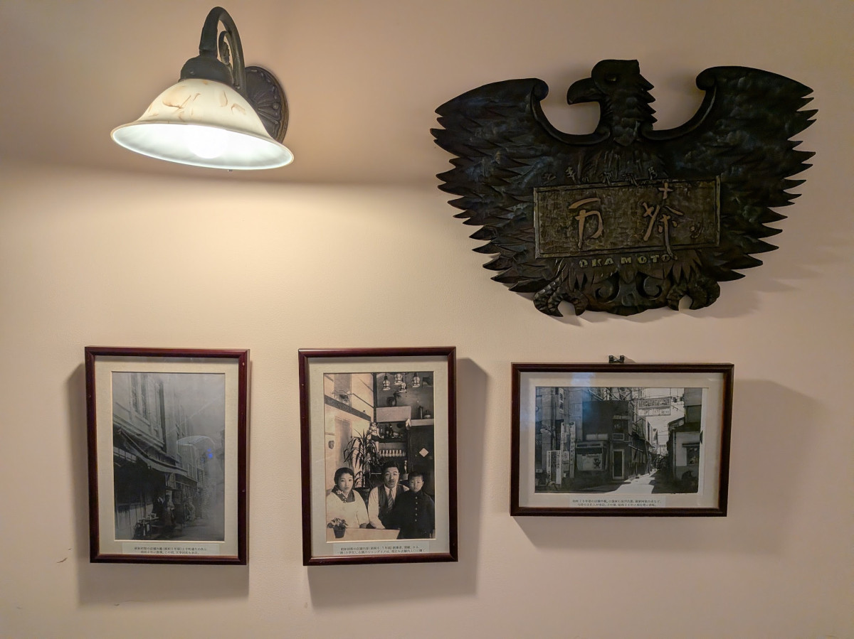 店のロゴマークにもなっているレリーフは旧制弘前高校(現・弘前大学)の生徒が寄贈したものとされるがそれ以上のことは分からないという。創業者の写真や創業当時の店の写真など