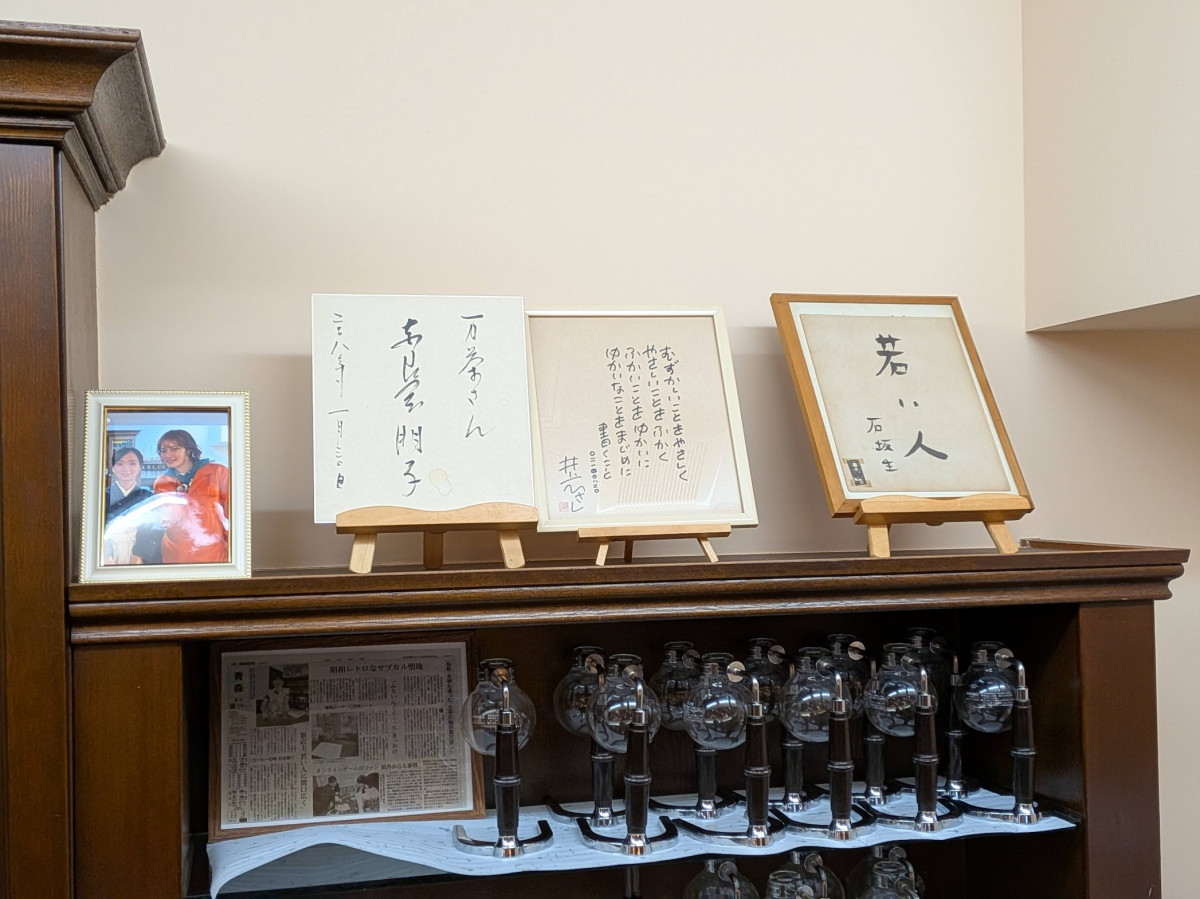 井上ひさしや石坂洋次郎らのサインが並び、弘前出身のタレント王林さんの写真が追加された