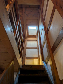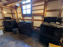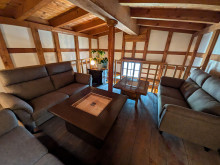 壁側にベンチを配置し、バーテーブルを置く店内。蔵の雰囲気を残した