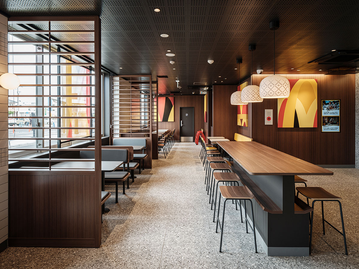 マクドナルドの次世代店舗デザイン。マクドナルドのロゴマーク「M」をアートとして再解釈し、遊び心を取り入れた店舗内装となる(写真提供=日本マクドナルド)