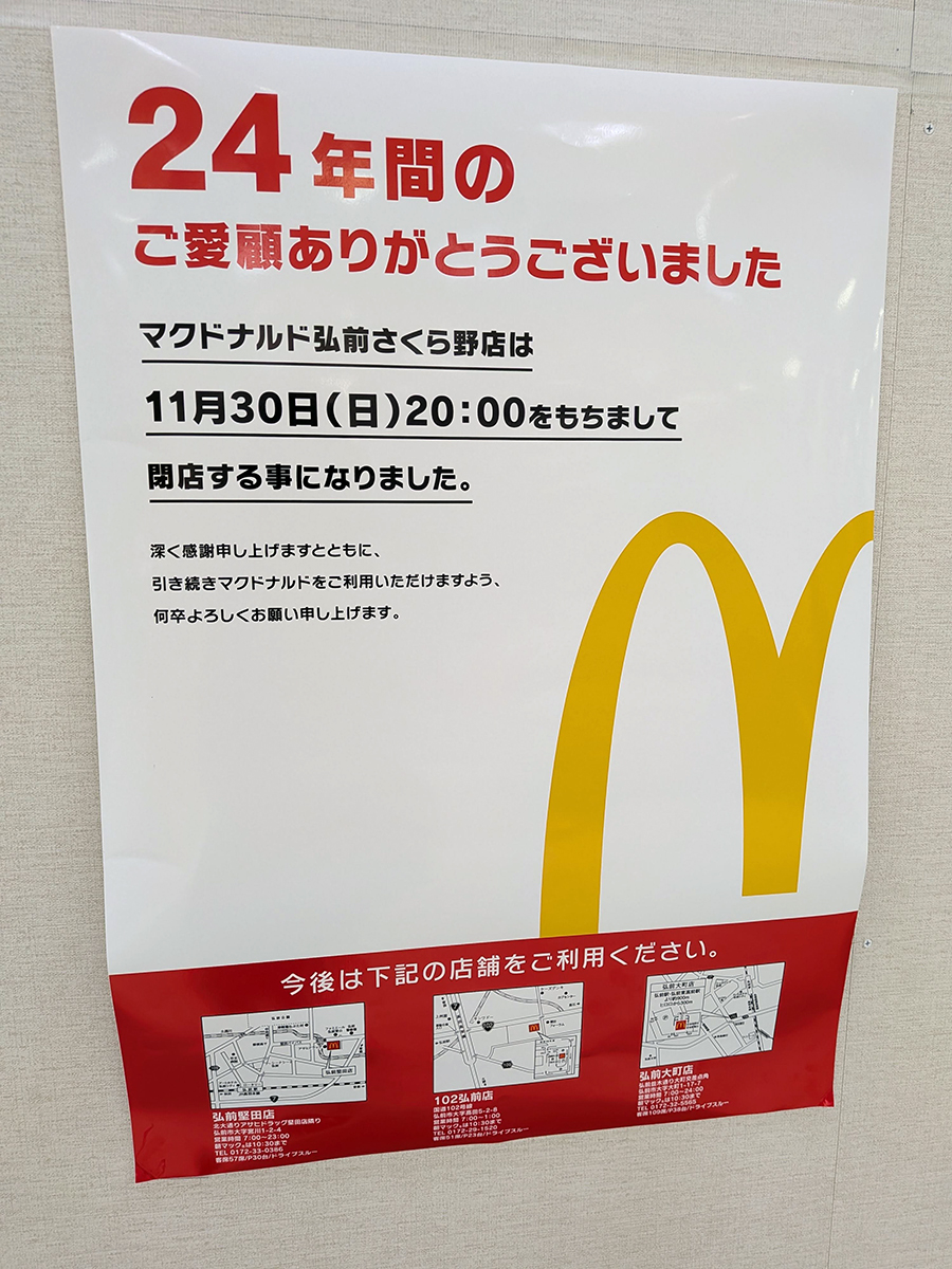 マクドナルド弘前城東北店(弘前市城東北4、TEL 0172-88-6844)が12月24日、オープンした。