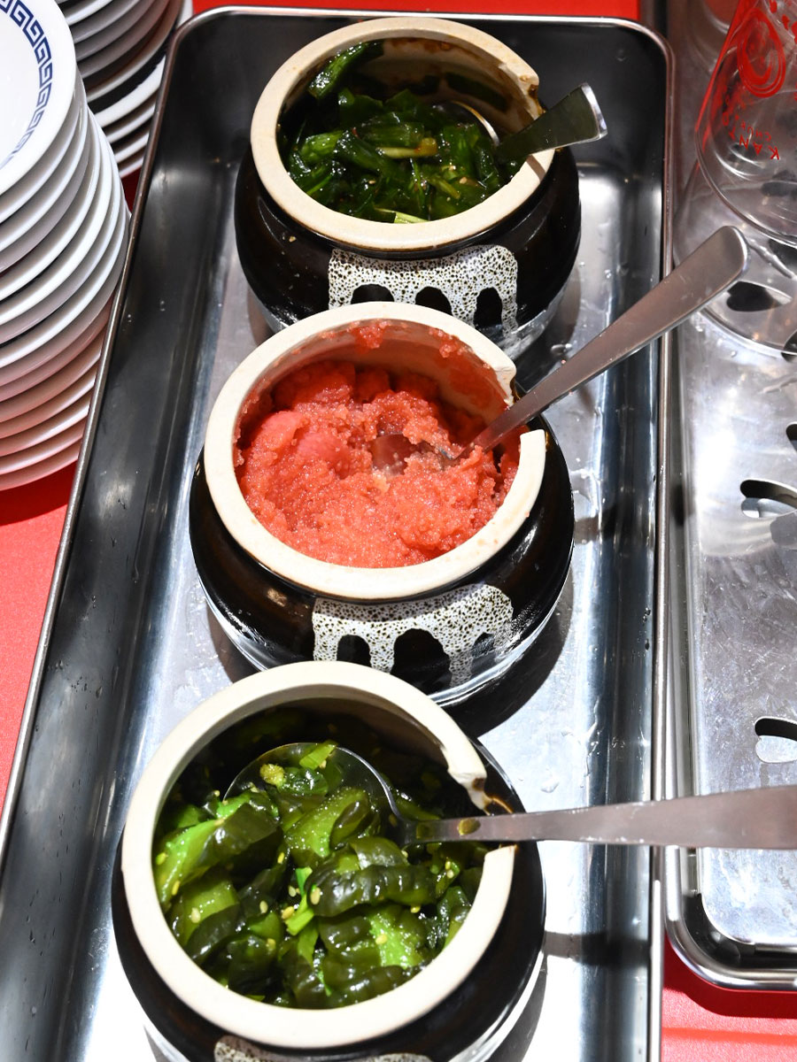 辛子明太子、漬物、ニラの壺漬け。味変やご飯(200円)のトッピングなどに。ラーメン購入者のみ