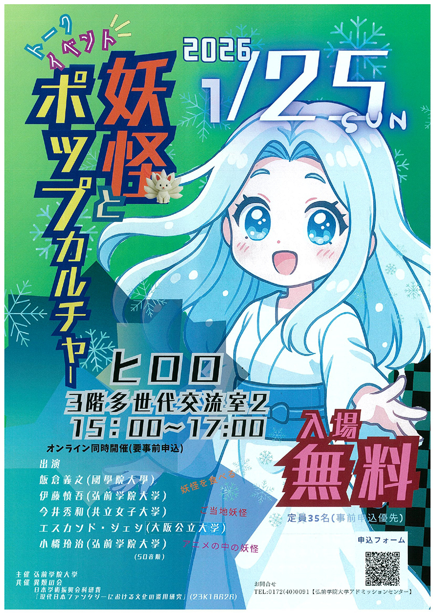 トークイベント「妖怪とポップカルチャー」が1月25日、商業施設「ヒロロ」(弘前市駅前町)3階・多世代交流室2で開催される。