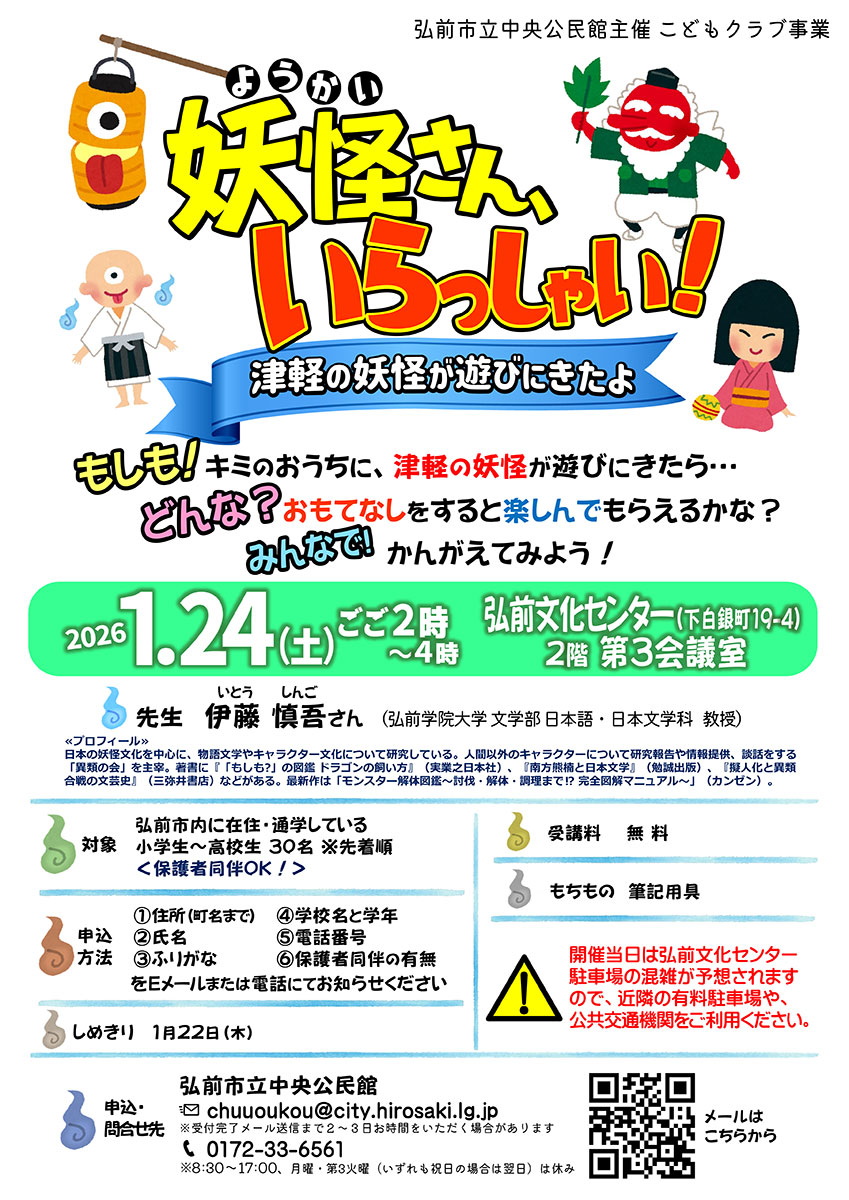 トークイベント「妖怪とポップカルチャー」が1月25日、商業施設「ヒロロ」(弘前市駅前町)3階・多世代交流室2で開催される。