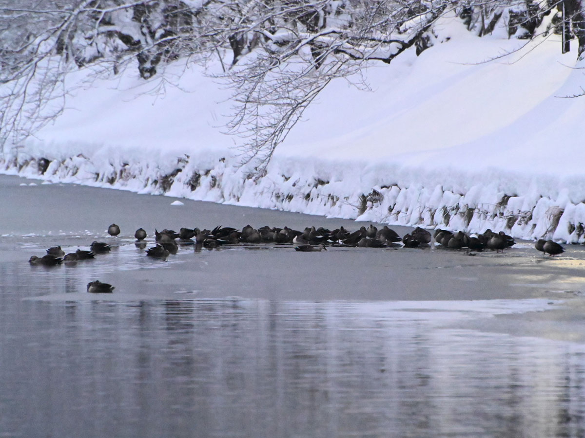 氷と水の境界が変わるため、カルガモの待機場所が日によって異なる