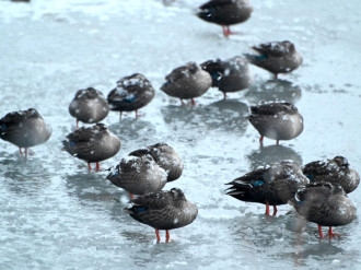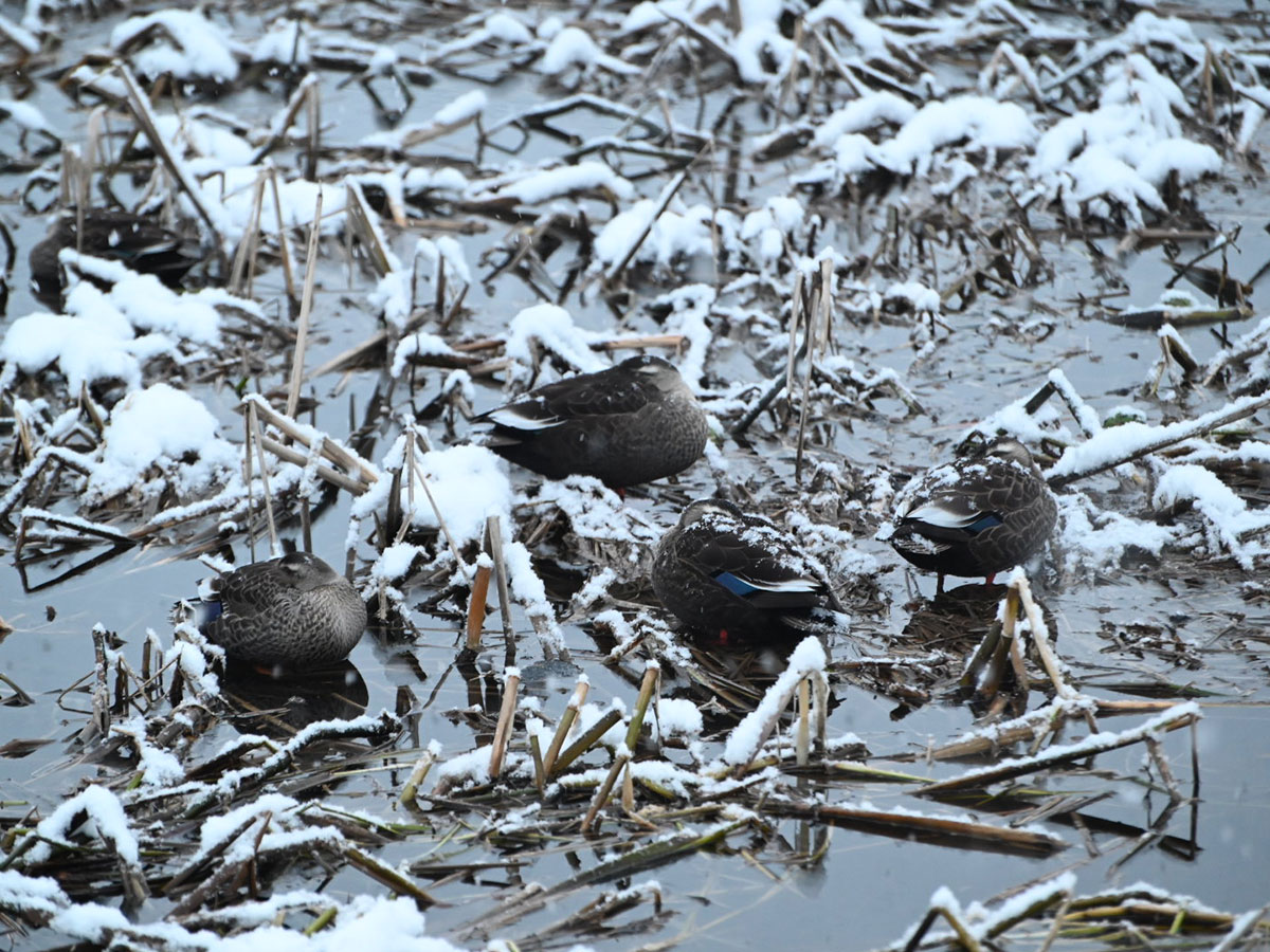 弘前公園のカルガモが現在、氷上で吹雪に耐えている。