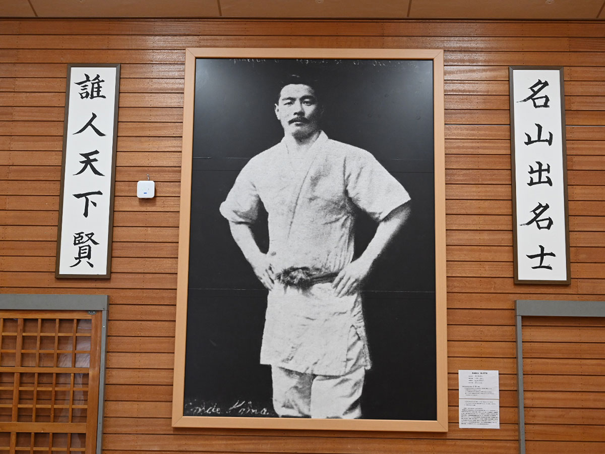 船沢中学校の体育館「コンデ・コマ記念武道場」に設置する肖像。「名山出名士」「誰人天下賢」は弘前出身で明治のジャーナリスト・陸葛南(くがかつなん)の言葉