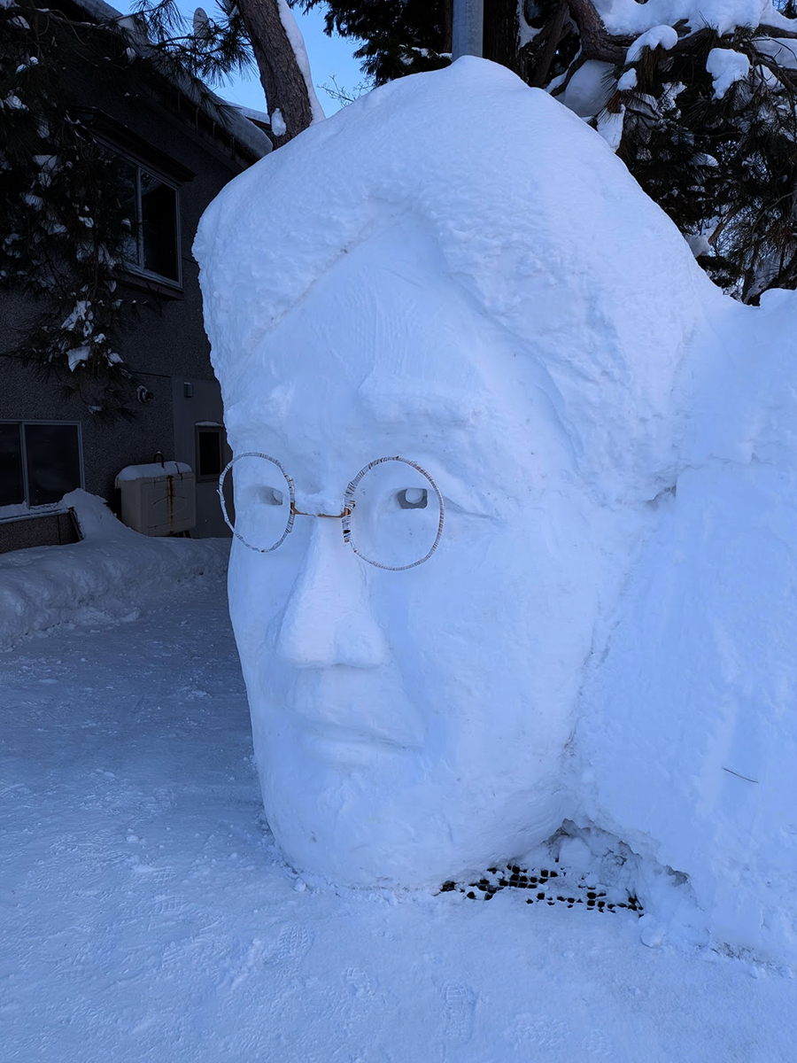 弘前・清水森の住宅街に1月20日、お笑い芸人のシソンヌじろうさんの雪像が設置された。