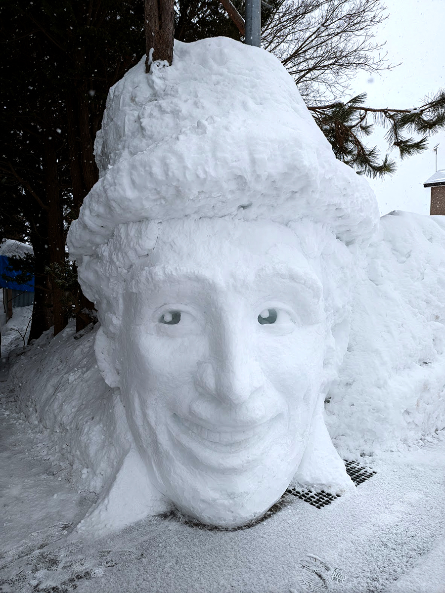 弘前・清水森の住宅街に1月20日、お笑い芸人のシソンヌじろうさんの雪像が設置された。