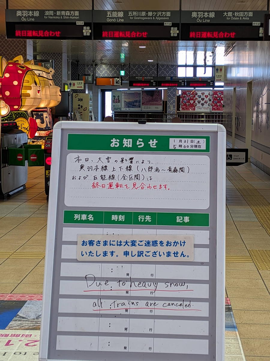 1月31日の奥羽本線は終日運転を見合わせる。同日5時発表