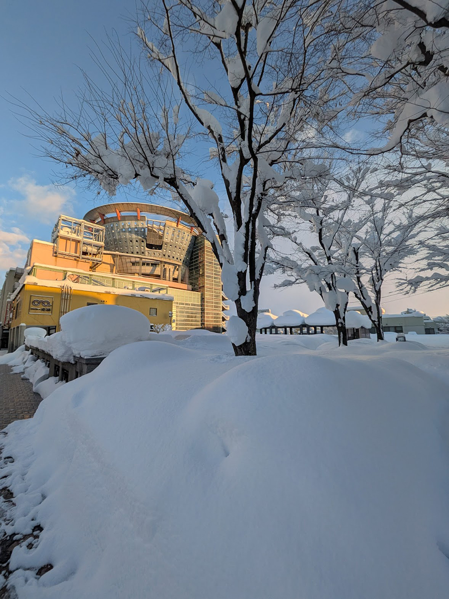 雪に埋もれた蓬莱広場と中三