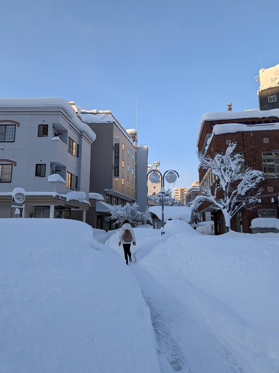 弘前駅から土手町を結ぶ遊歩道。現在は積雪により、一人が通れるほどの幅しかない