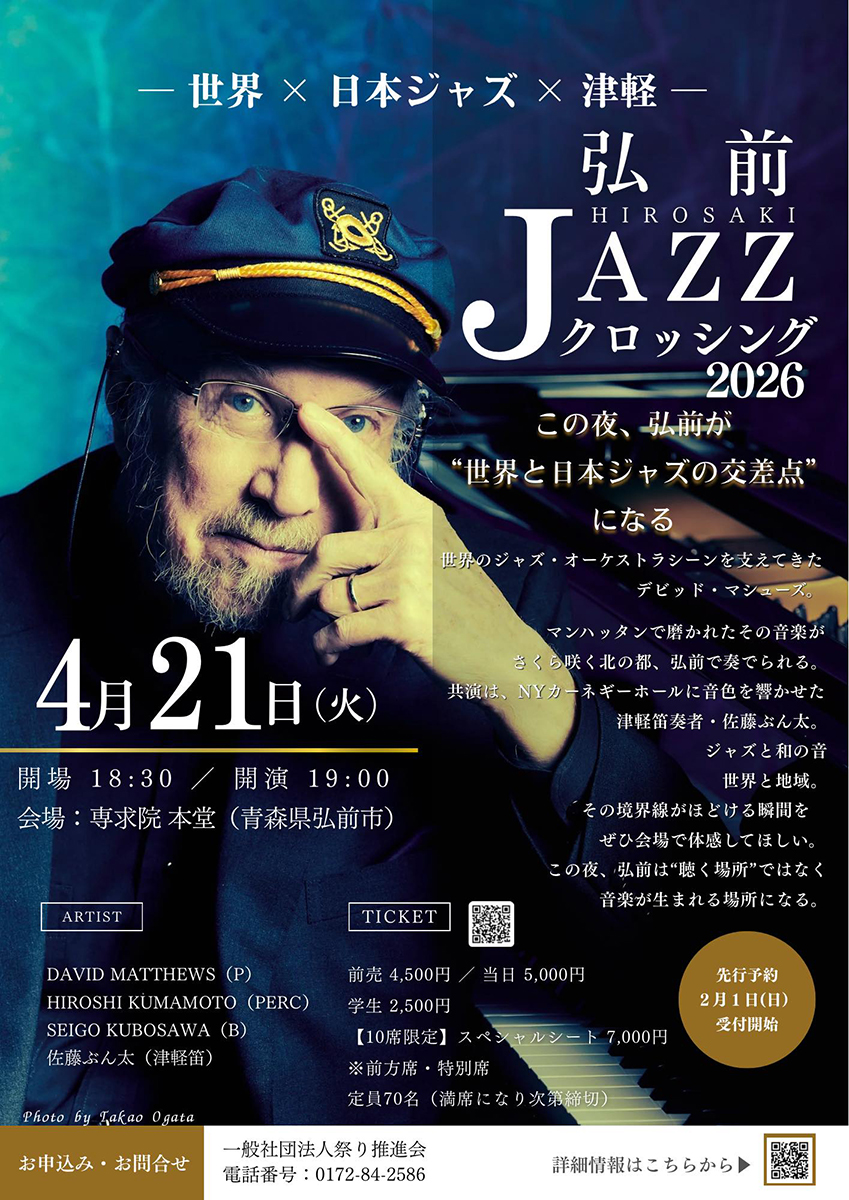 ジャズピアニストのデビッド・マシューズさんとパーカッショニスト・熊本比呂志さん、ベーシスト・久保沢清吾さん、津軽笛演奏者の佐藤ぶん太さんが出演。18時30分開場、19時開演。チケットは前売り券=4,500円、当日=5,000円、学生=2,500円、スペシャルシート=7,000円。チケットの先行予約を「ぶん太商店チケットSTORE」で現在受け付けている