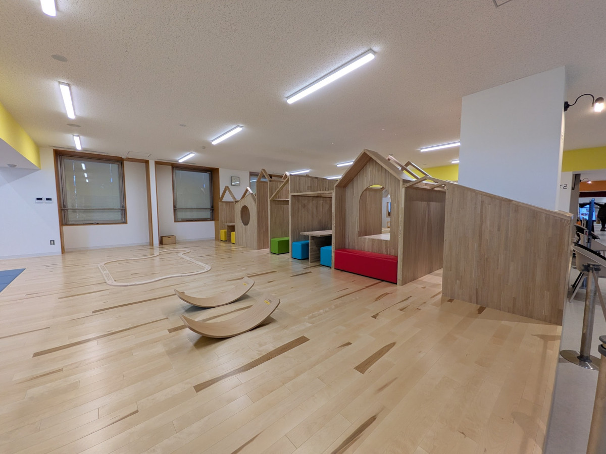 「でんしゃ」「おみせ」「おうち」の3つのエリアに分かれている。2階にある
