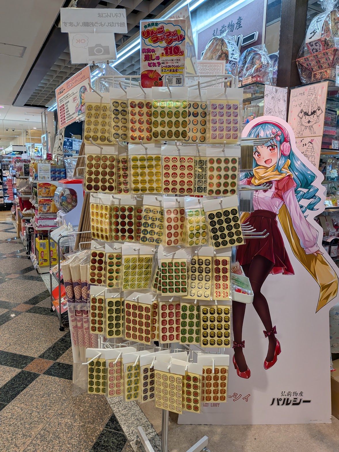 40種のシールを販売。シールの種類は津軽印刷が管理しきれないほどあるといい、販売する品種シールはランダムで並ぶという。好きなリンゴから選ぶ人もいる。後ろに映っているのはパルシーのオリジナルキャラクター「弘前ルーシィ」