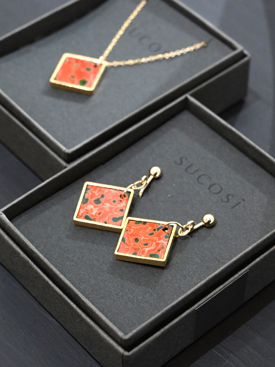 「SUCOSi(スコシ)」は津軽塗ブランド「KABA(カバ)」のアクセサリーシリーズ。気取らず普段使いできる「いつものアクセサリー」がコンセプト。佳子さまが身につけていたのは「しかく朱緑(唐塗)」で、黒と朱色が映えるベーシックな唐塗。差し色にグリーンや錫粉入る。価格は1万2,100円