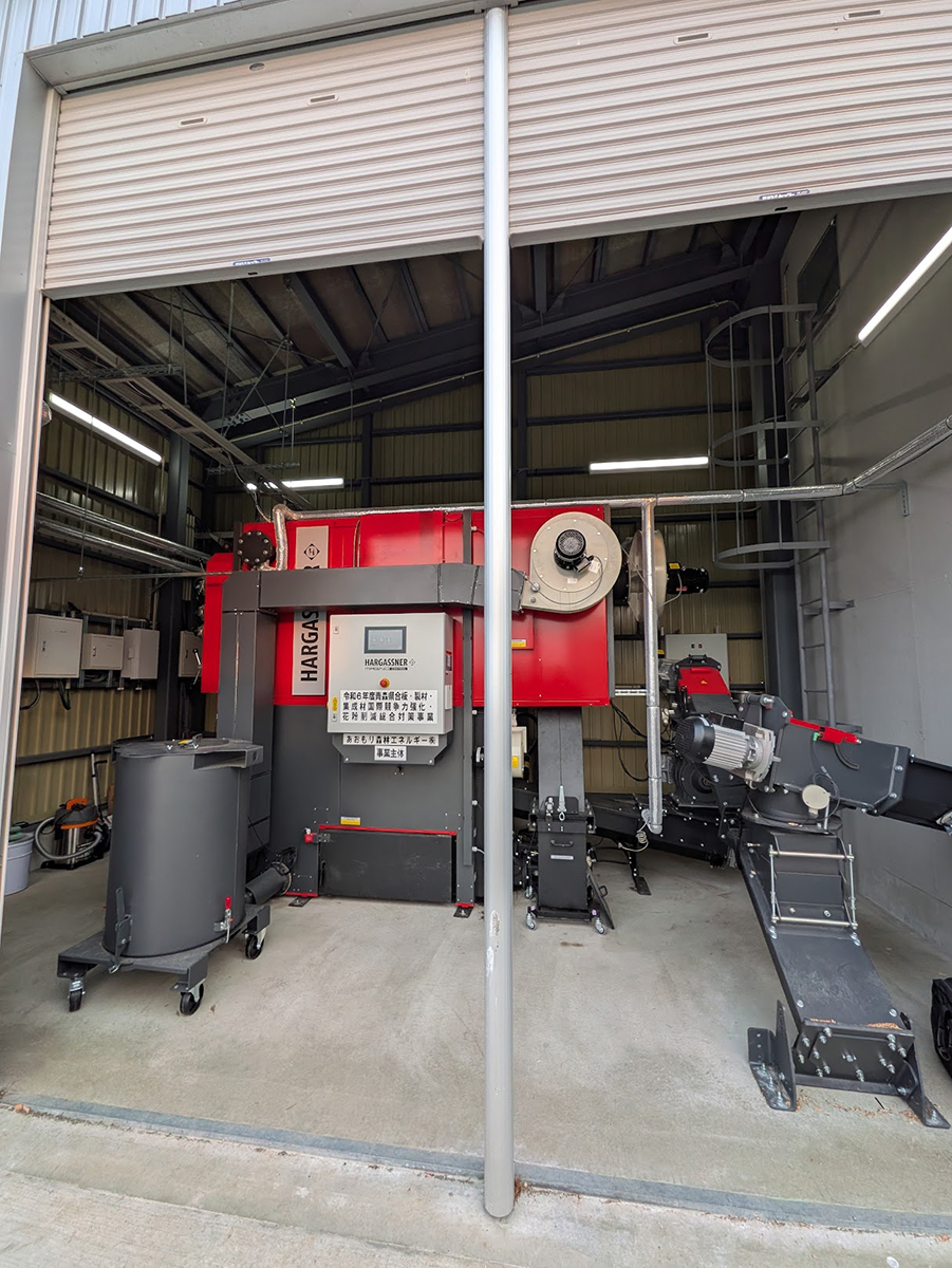 欧州製のチップボイラー。「花の湯」の敷地内に設置した。青森県内では珍しく、同社によると、2020年以降の高性能チップボイラーの導入は青森県内では初という