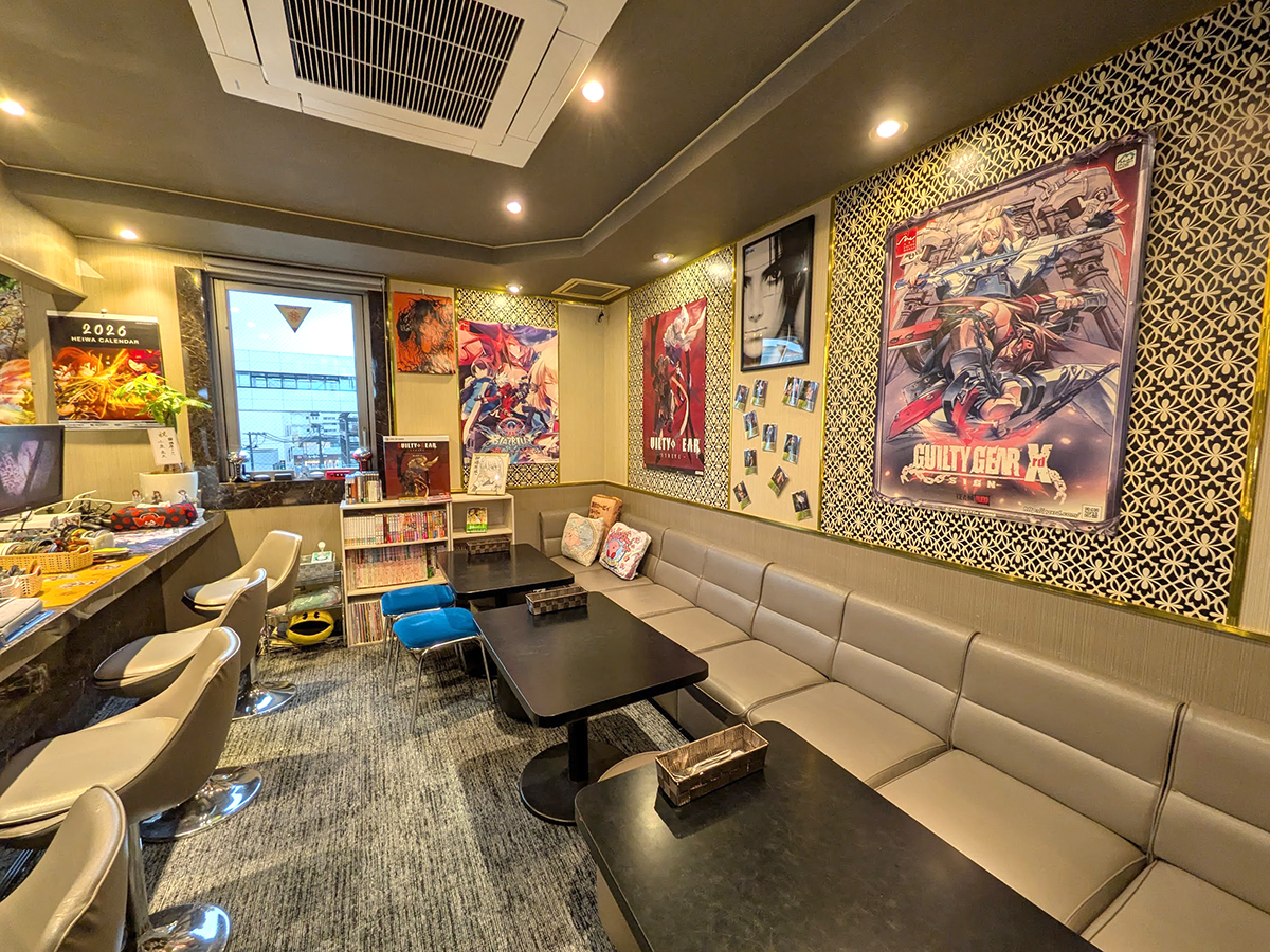 大沼さんの私物などが並ぶ店内。カウンター席とテーブル席があり、ゲームセンターで使用された椅子などもある
