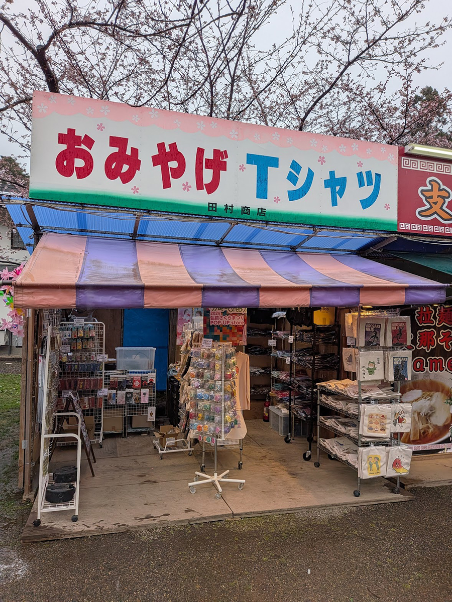 津軽弁シール(100円)やキーホルダー(400円)などを販売。「りんごつぶつぶシール」(110円)を取り扱うほか、AIで作成したイラストをプリントした津軽弁イラストTシャツ(3,300円)も販売。「さくらまつりのネタになれば」と店主