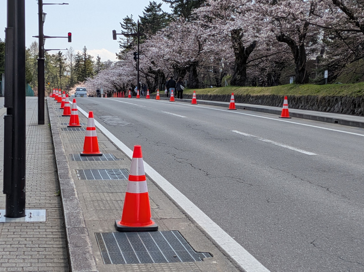 弘前公園中央高校口付近の道路沿いに現在、パイロンが設置され、弘前市観光課が自転車などの安全運転を呼びかけている。