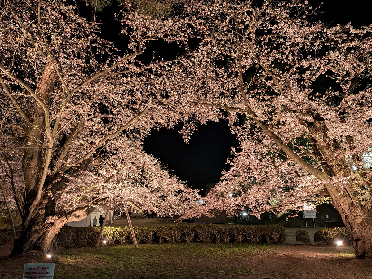 サクラの枝が重なりあって立体的に描いているため、見物客らは高さや角度を変えてハートに見える場所を探していた
