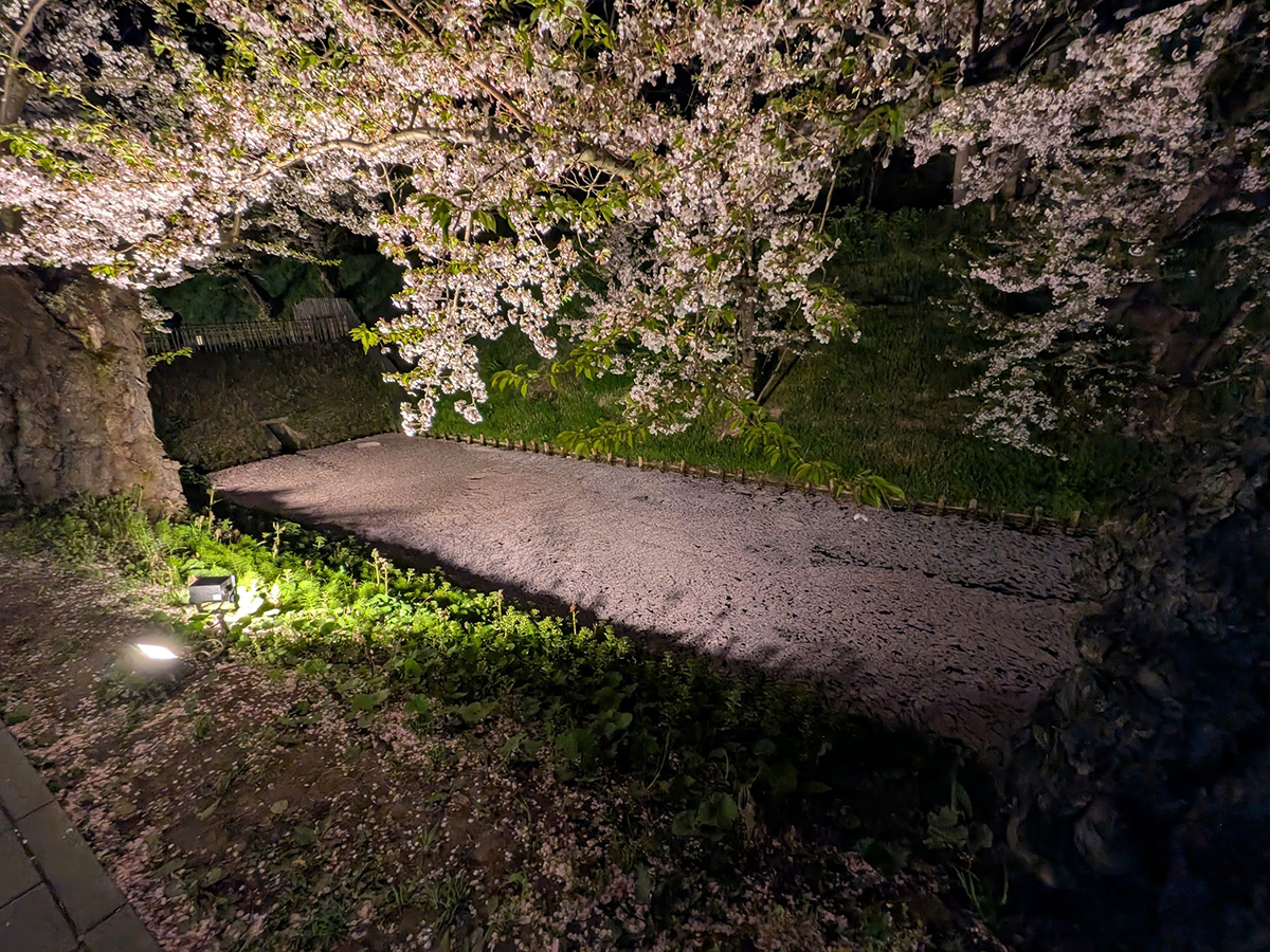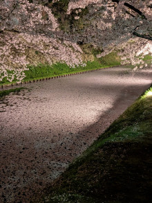 散ったサクラの花びらが水面に浮かぶ「花いかだ」が現在、弘前公園で見頃を迎えている。