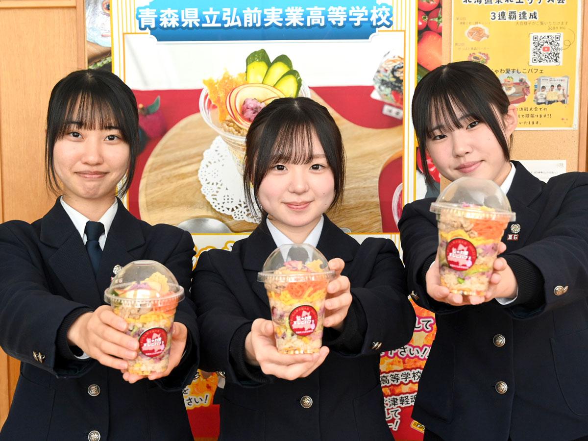 弘前実業高校3年生の生徒3人が開発した「じゃわ愛(めぐ)すしこパフェ」が2月14日・15日、青森県内のスーパーマーケットチェーン「ユニバース」で販売される。