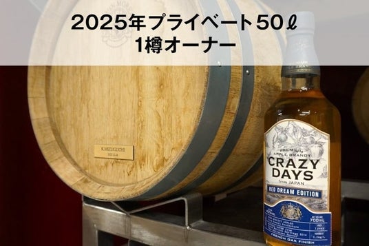 ◎ 2025年プライベート50リットル樽オーナー世界にひとつ、自分だけのアップルブランデーを熟成できるプレミアムプラン。青森県産りんごを原料にした原酒を50リットル樽に詰め、最大1年間貯蔵・保管いたします。ラベル製作・貼付け・ボトリングまでをすべて含むオールインパッケージ。熟成の進み具合を感じながら、世界にたったひと樽の“あなたのCRAZY DAYS”を育ててください。