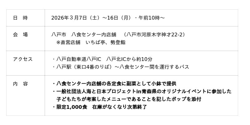 一般社団法人海と日本プロジェクトin青森県は、9月13日(土)・14日(日)に「海からひらけた街八戸 ~あおもりイカ調査団~」を実施しました。その中で参加した子どもたちがレシピ考案した新メニューを期間限定・数量限定で披露します。このイベントは、次世代へ豊かで美しい海を引き継ぐために、海を介して人と人とがつながる“日本財団「海と日本プロジェクト」”の一環です。