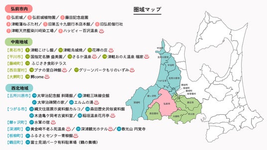 津軽圏域14市町村:弘前市、黒石市、五所川原市、つがる市、平川市、鰺ヶ沢町、深浦町、西目屋村、藤崎町、大鰐町、田舎館村、板柳町、鶴田町、中泊町