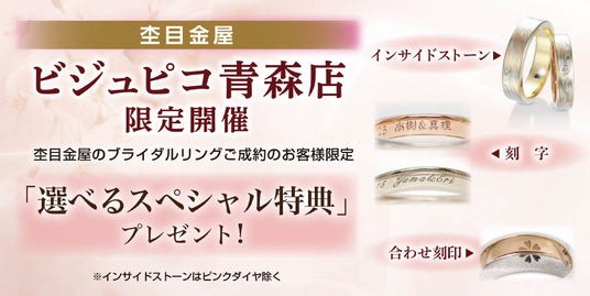 期間中ビジュピコ 青森店にて、杢目金屋のブライダルリングをご成約のお客様に、下記特典の内いずれかをプレゼント!