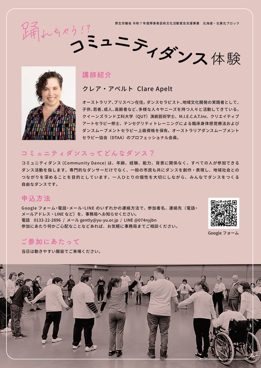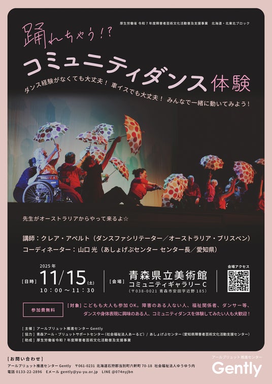 アールブリュット推進センターGently(運営:社会福祉法人ゆうゆう)は、来る11月15日(土)、青森県立美術館コミュニティギャラリーC(青森市)において、ダンスワークショップ「踊れちゃう!?コミュニティダンス体験」を開催します。「コミュニティダンス」は、年齢、経験、能力、背景に関係なく、すべての人が参加できるダンス活動です。オーストラリアから来日するダンスセラピストのクレア・アペルトさんといっしょに新感覚のダンスを体験してみませんか?