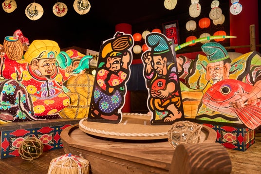 七福神は福を招く神様として知られています。青森屋のパブリックスペース「じゃわめぐ(*2)広場」に恵比寿天、大黒天、毘沙門天、弁財天、布袋尊、福禄寿、寿老人の7体のねぶたが登場し、宿泊者を出迎えます。制作者はねぶた師の内山龍星(うちやまりゅうせい)氏と立田龍宝(たつたりゅうほう)氏です。ねぶたでつくられた七福神を間近で眺めることができ、記念写真を撮影して楽しめます。