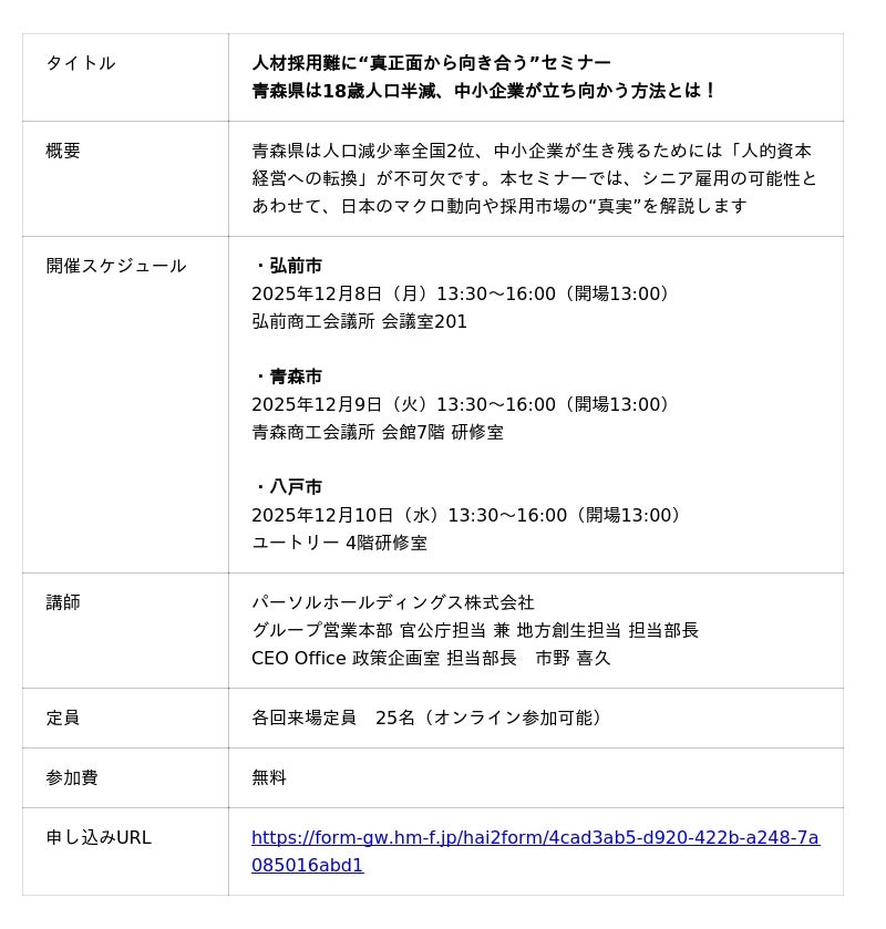 具体的には、弘前市・青森市・八戸市でシニア雇用の啓発セミナーを開催。企業のシニア雇用のお悩みを伴走支援するプログラムも開始します。また、職場体験会とバスツアーも予定しています。