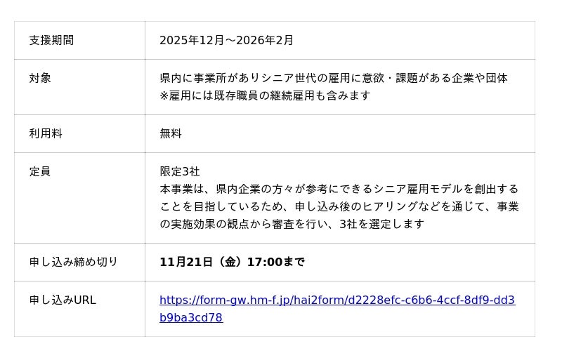 企業とシニア世代の求職者双方のニーズに寄り添った支援を展開し、人材不足が顕著な業種の企業を中心に実践的な雇用促進策を推進することで、県内企業の人材不足解消とシニア世代の活躍の場拡大を目指してまいります。