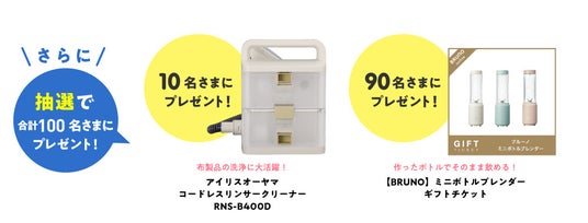 本キャンペーンは、期間中にペット保険にお申込みいただいたご成約者さま全員に、「サンマルクカフェ カフェギフトチケット200円」をプレゼントします。さらに、保有契約件数100万件突破にちなみ、抽選で合計100名さまに豪華景品が当たります。10名さまには布製品の洗浄ができるリンサークリーナー、90名さまには、つくったドリンクをボトルのまま飲めるボトルブレンダーのギフトチケットをプレゼントします。